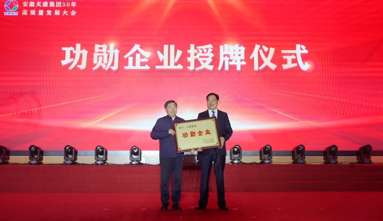 天長(zhǎng)市委書(shū)記賀家平為安徽天康集團(tuán)頒授了 “功勛企業(yè)”榮譽(yù)牌匾。