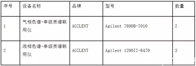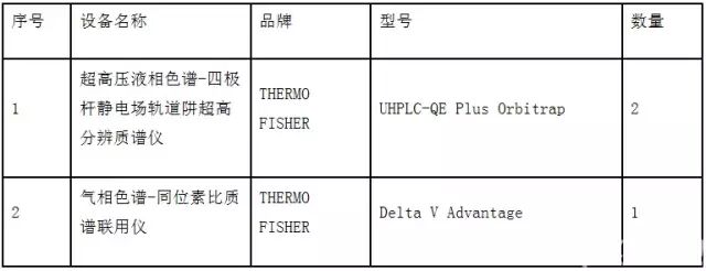 包括賽默飛的超高壓液相色譜-四極桿靜電場軌道阱超高分辨質譜儀UHPLC-QE Plus Orbitrap、氣相色譜-同位素比質譜聯用儀Delta V Advantage;安捷倫的7890B-7010氣相色譜-串級質譜聯用儀、1290II-6470液相色譜-串級質譜聯用儀;沃特世的半制備高效液相色譜儀Waters 2695+WFCIII等;此外還有德國西門子的全自動化學發光免疫分析儀ADVIA CentaurXP、英國IDS的全自動生化免疫分析儀IDS-iSYS、羅氏的電化學發光全自動免疫分析儀Roche cobas e411、德國BERTHOLD的伽瑪計數器LB2111。