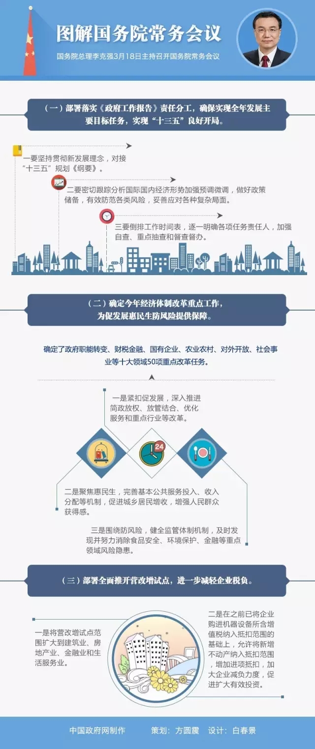 3月18日,為落實《政府工作報告》關于全面實施營改增的要求,進一步減輕企業負擔,促進經濟結構轉型升級,國務院常務會議進行了部署。從今年5月1日起,一是將營改增試點范圍擴大到建筑業、房地產業、金融業和生活服務業,實現貨物和服務行業全覆蓋,打通稅收抵扣鏈條,支持現代服務業發展和制造業升級。二是在之前已將企業購進機器設備所含增值稅納入抵扣范圍的基礎上,允許將新增不動產納入抵扣范圍,增加進項抵扣,加大企業減負力度,促進擴大有效投資。同時,新增試點行業的原有營業稅優惠政策原則上延續,對特定行業采取過渡性措施,對服務出口實行零稅率或免稅政策,確保所有行業稅負只減不增。預計今年營改增將減輕企業稅負5000多億元。