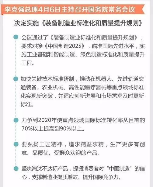 當天會議決定實施《裝備制造業標準化和質量提升規劃》。李克強說,堅持標準引領,建設制造強國,是結構性改革尤其是供給側結構性改革的重要內容,有利于改善供給、擴大需求,促進產品產業邁向中高端。