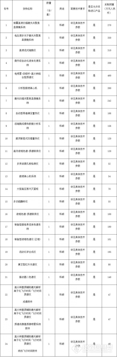 此次采購項(xiàng)目包含24臺(tái)/套儀器設(shè)備,其中質(zhì)譜相關(guān)儀器6臺(tái)/套,液相色譜相關(guān)儀器3臺(tái)/套,顯微鏡相關(guān)儀器2臺(tái)/套。這些儀器設(shè)備的預(yù)算金額超過200萬元的,多達(dá)7臺(tái)/套,其中電噴霧-四極桿-高分辨組合型質(zhì)譜儀的預(yù)算金額更是多達(dá)460萬元。此次招標(biāo)可謂儀器采購的又一大單,最終花落隨家,讓我們拭目以待。