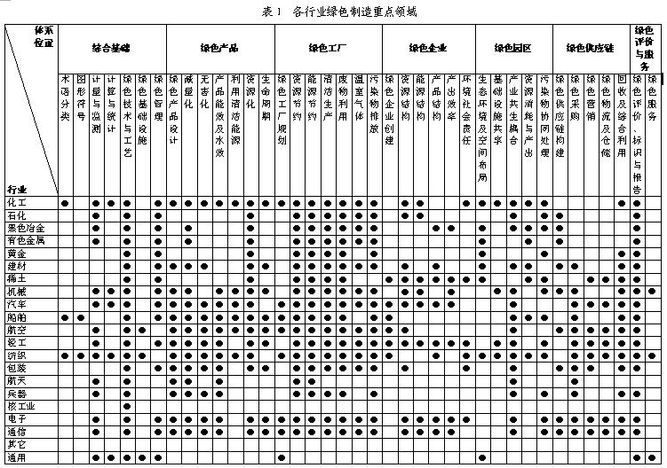 綠色制造標準體系充分體現綜合、系統、集成的特點,推動綠色產品、綠色工廠、綠色企業、綠色園區、綠色供應鏈從設計規劃到評價服務等重點領域標準制修訂。各行業根據國家和產業發展規劃要求和產業特性確定的綠色制造重點領域如表1所示。
