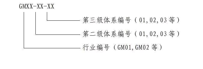 各行業代號為化工(GM01)、石化(GM02)、黑色冶金(GM03)、有色金屬(GM04)、黃金(GM05)、建材(GM06)、稀土(GM07)、機械(GM08)、汽車(GM09)、船舶(GM10)、航空(GM11)、輕工(GM12)、紡織(GM13)、包裝(GM14)、航天(GM15)、兵器(GM16)、核工業(GM17)、電子(GM18)、通信(GM19),適用于多個行業的標準代號使用GM00。