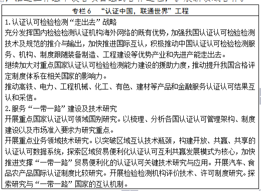 深入落實“走出去”戰略。以自由貿易區及“一帶一路”沿線國家為重點,加強“走出去”戰略研究和政策推進。在行政審批、結果互認、認可服務、創新支持等方面,為認證認可檢驗檢測服務出口集中區域提供支持。加強部際合作,建立健全“走出去”聯動機制,推動認證認可檢驗檢測“走出去”相關政策制定和實施,加大“走出去”投融資支持措施,推進認證認可檢驗檢測與政府援助項目、政府招標項目、亞投行項目等的深度融合,鼓勵檢驗檢測認證機構通過各種形式進行資源整合,充分利用國際國內兩個市場、兩種資源,增強競爭能力,加強風險防范,積極推動中國認證認可檢驗檢測服務、機構、制度跟隨裝備制造、工程建設等優勢產業和先進產能“走出去”。