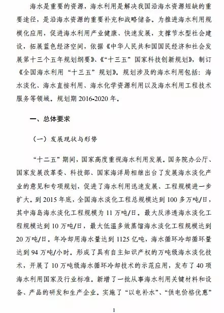 據(jù)發(fā)改委網(wǎng)站近日發(fā)布的消息,為貫徹落實(shí)《中華人民共和國國民經(jīng)濟(jì)和社會(huì)發(fā)展第十三個(gè)五年規(guī)劃綱要》關(guān)于推動(dòng)海水淡化規(guī)模化應(yīng)用的要求,促進(jìn)海水利用健康、快速發(fā)展,發(fā)改委、海洋局組織編制并印發(fā)《全國海水利用“十三五”規(guī)劃》。