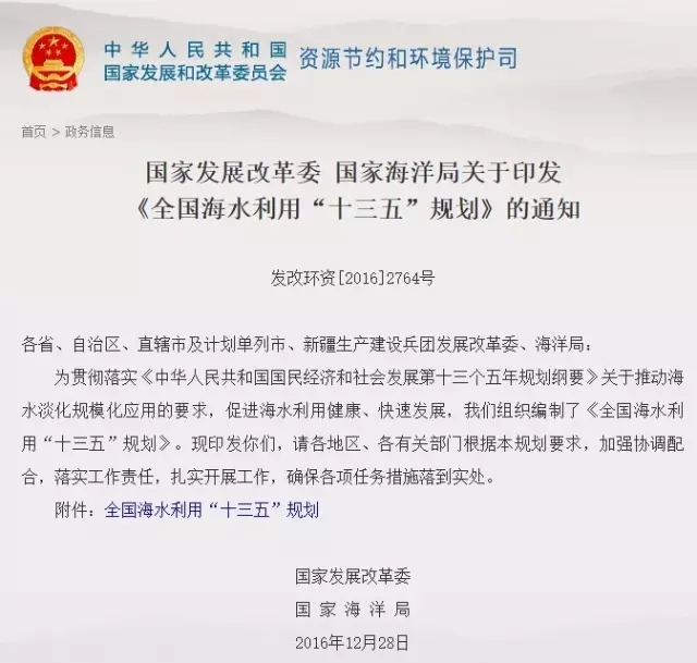 附:《國家發(fā)展改革委 國家海洋局關(guān)于印發(fā)<全國海水利用“十三五”規(guī)劃>的通知》全文