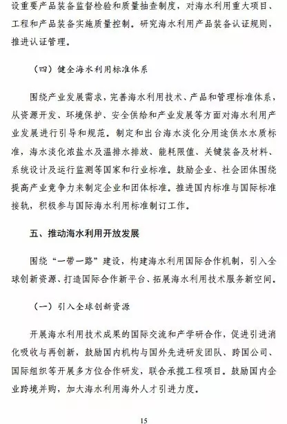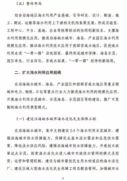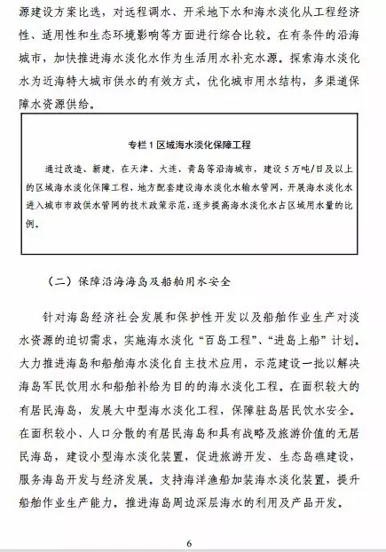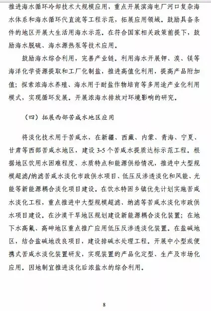 規(guī)劃要求,在沿海缺水城市、海島、產(chǎn)業(yè)園區(qū)和西部苦咸水地區(qū)等重點(diǎn)領(lǐng)域和電力、鋼鐵、石化等重點(diǎn)行業(yè)大力推進(jìn)海水利用的規(guī)模化應(yīng)用,開展海水利用示范城市、示范海島、示范園區(qū)等的建設(shè),推廣可復(fù)制的海水利用典型模式。
