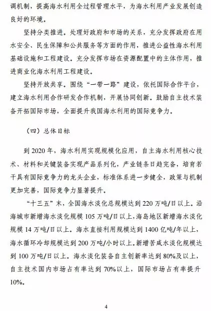 規(guī)劃提出,到2020年,海水利用實(shí)現(xiàn)規(guī)模化應(yīng)用,自主海水利用核心技術(shù)、材料和關(guān)鍵裝備實(shí)現(xiàn)產(chǎn)品系列化,產(chǎn)業(yè)鏈條日趨完備,培育若干具有國際競(jìng)爭(zhēng)力的龍頭企業(yè),標(biāo)準(zhǔn)體系進(jìn)一步健全,政策與機(jī)制更加完善,國際競(jìng)爭(zhēng)力顯著提升。“十三五”末,全國海水淡化總規(guī)模達(dá)到220萬噸/日以上。沿海城市新增海水淡化規(guī)模105萬噸/日以上,海島地區(qū)新增海水淡化規(guī)模14萬噸/日以上。海水直接利用規(guī)模達(dá)到1400億噸/年以上,海水循環(huán)冷卻規(guī)模達(dá)到200萬噸/小時(shí)以上。新增苦咸水淡化規(guī)模達(dá)到100萬噸/日以上。海水淡化裝備自主創(chuàng)新率達(dá)到80%及以上,自主技術(shù)國內(nèi)市場(chǎng)占有率達(dá)到70%以上,國際市場(chǎng)占有率提升10%。