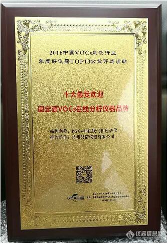 “2016中國VOCs檢測行業—年度好儀器TOP10公益評選活動”歷經6天、30個品牌公開、公平、公正的激烈角逐,磐諾PGC-80在線氣相色譜儀憑借良好的群眾口碑,最終晉升TOP10,榮獲“十大最受歡迎固定源VOCs在線分析儀器品牌”!