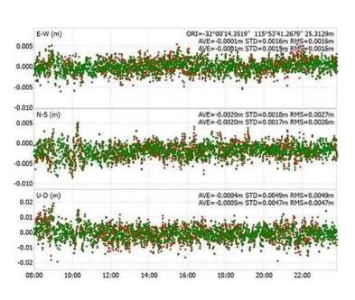 三星系統(紅色)和四星(綠色)系統RTK解算偏差時序對比圖