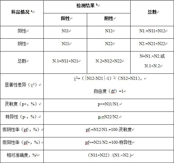 快速檢測方法應與方法中規定的參比方法進行一致性比較。與參比方法一致性分析統計方法常見卡方檢驗,具體可見附表中顯著性差異(c2)所示,一般: