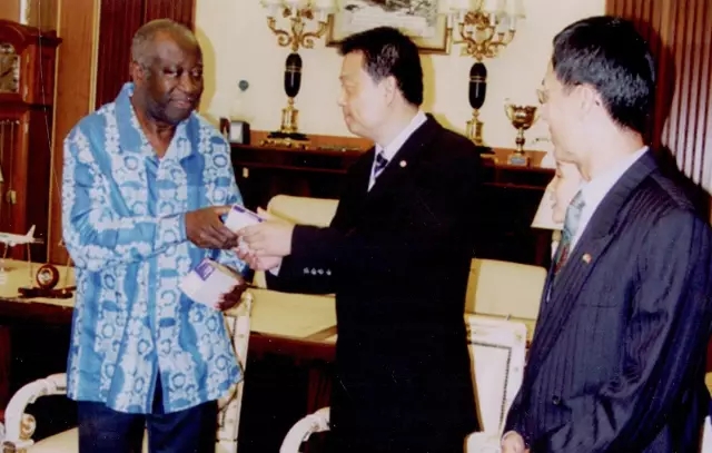 ▲2007年,何勤(中)代表華立醫藥產業中的昆藥集團向科特迪瓦總統(左)捐贈青蒿素藥品