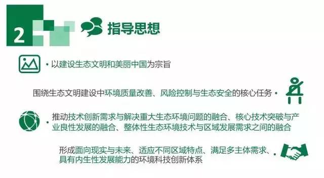 全面貫徹黨的十八大和十八屆三中、四中、五中、六中全會精神,以建設生態文明和美麗中國為宗旨,堅持創新驅動發展戰略,進一步落實《國家中長期科學和技術發展規劃綱要(2006-2020年)》,按照支撐重點區域整體發展、管控脆弱生態環境風險、部署前瞻生態環境技術、形成可競爭環保產業、惠及日益迫切民生需求的思路,圍繞生態文明建設中環境質量改善、風險控制與生態安全的核心任務,推動技術創新需求與解決重大生態環境問題的融合、核心技術突破與產業良性發展的融合、整體性生態環境技術與區域發展需求之間的融合,形成面向現實與未來、適應不同區域特點、滿足多主體需求、具有內生性發展能力的環境科技創新體系,支撐美麗中國夢的實現。