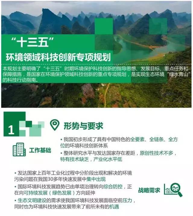 為推進我國環境保護科技工作,持續加大科技對生態文明建設的支撐力度,強化科技創新促進生態環境質量持續改善,針對我國主要環境問題與科技需求,依據《“十三五”國家科技創新規劃》和《“十三五”生態環境保護規劃》有關精神和要求,編制本規劃。本規劃主要明確了“十三五”時期環境保護科技創新的指導思想、發展目標、重點任務和保障措施,是國家在環境保護領域科技創新的專項規劃,是實現生態環境“綠水青山”的科技行動指南。