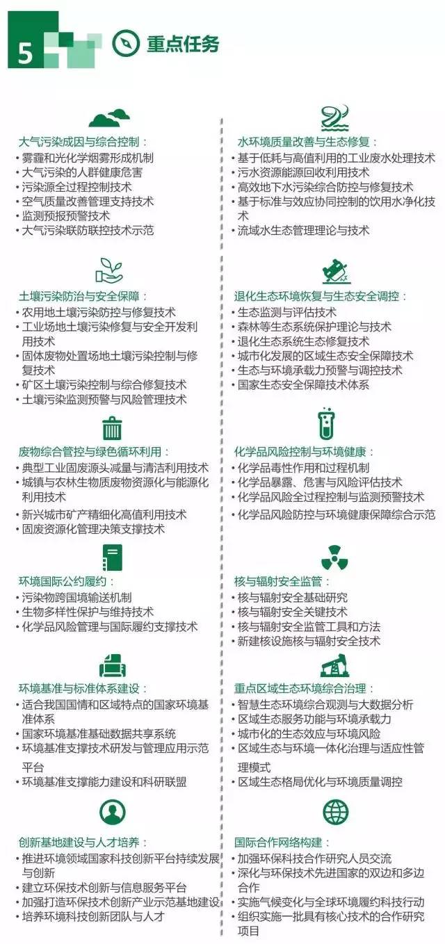 針對我國“十三五”環境領域科技發展需求,以改善環境質量、降低環境風險、構建安全生態體系為目標,圍繞大氣、水、土壤、污染治理、生態系統修復,以及清潔生產與循環經濟、環境基準與標準、核與輻射安全監管、化學品管理與國際履約等關鍵環境問題,開展基礎研究與技術研發,實施重點區域生態環境綜合治理,并推進環保產業發展和科技基地建設。重點開展以下12項任務。