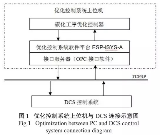 碳化工序優化控制器運行在優化控制系統上位機中,OPC Server 通訊接口軟件作為連接先進控制上位機與 DCS數據交互的橋梁。先進控制上位機通過 OPC 接口服務器,與安裝有 OPC Server 的 DCS 操作站聯接,由于該操作站與DCS 控制站通過內部協議建立了數據傳送的物理鏈接,這樣先進控制系統也就與 DCS 控制站實現了數據傳送的物理鏈接。先進控制系統與 DCS 控制站兩者的數據交換是通過OPC 標準接口來實現的。軟件結構如圖 1 所示。