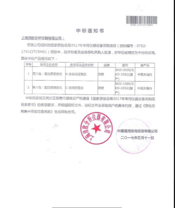 中標產品:SKD-3000全自動凱氏定氮儀、SKD-1000全自動凱氏定氮儀、SKD-20S3紅外石英消化爐。(SKD-3000 全自動凱氏定氮儀是SKD-2000的升級產品。2014年,全自動凱氏定氮儀SKD-2000榮獲“上海科委高新技術轉換項目”,2017年榮獲“中國儀器儀表優秀成果轉化獎”。