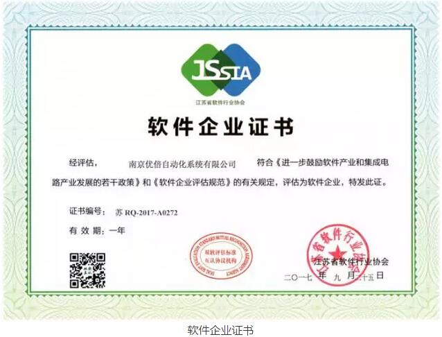 近日,根據《進一步鼓勵軟件產業和集成電路產業發展的若干政策》和《軟件企業評估規范》的有關規定,南京優倍自動化系統有限公司被認定為江蘇省軟件企業。