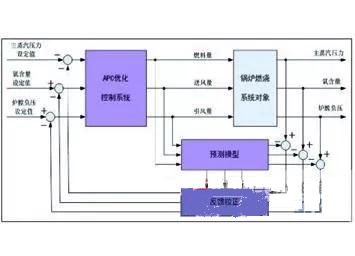 鍋爐的燃燒過程是一個極其復雜的化學過程與物理傳熱過程,鍋爐的燃料量、送風量、引風量的控制具有強耦合、非線性、多變性、大滯后等特點,所以整個燃燒系統(tǒng)的控制必須協(xié)調(diào)控制才能保證鍋爐負荷、壓力、氧量、溫度、負壓的穩(wěn)定。針對鍋爐燃燒系統(tǒng)的這種特殊性,APC優(yōu)化控制系統(tǒng)的研發(fā)集成了多變量自適應(yīng)控制器、智能仿人工控制策略、預測控制、模糊控制、自動尋優(yōu)、反饋校正等核心技術(shù),真正實現(xiàn)了鍋爐在正常工況與異常工況下的全自動運行。優(yōu)化控制系統(tǒng)輸入輸出原理圖如圖1所示。