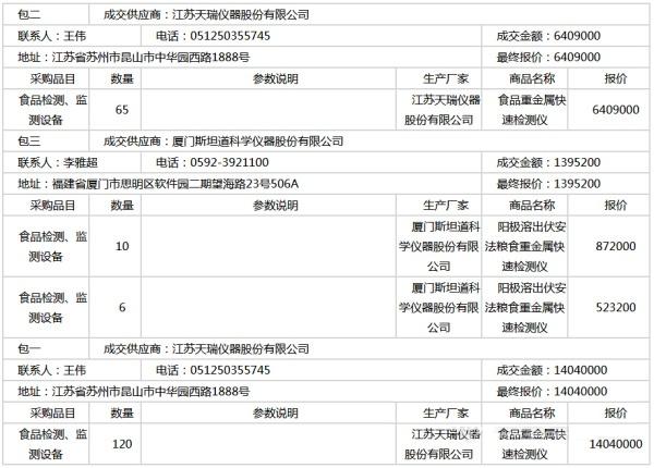 2017年12月29日,據湖南省糧食局 糧食重金屬快速檢測設備(第二批)采購 項目 公開招標中標公告顯示,天瑞儀器的X射線熒光光譜法糧食重金屬快速檢測儀(手動進樣)中標65臺,X射線熒光光譜法糧食重金屬快速檢測儀(自動進樣)中標120臺。總計185臺價值2044.9萬元。除過16臺陽極溶出伏安法糧食重金屬快速檢測儀,天瑞儀器幾乎包攬了這批湖南省糧食局的招標采購。
