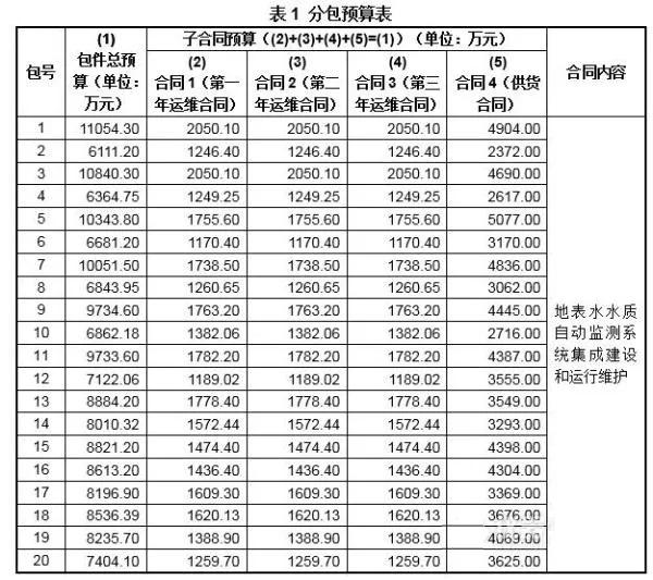 2018年1月31日,中國政府采購網發布《中國環境監測總站國家地表水自動監測系統建設及運行維護項目(包1至包20)公開招標公告》,此項目總預算為168445.45 萬元,將分為20包,且有些包數同一廠商不能同時中標。