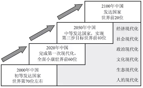 中國(guó)復(fù)興是中國(guó)衰落后再次成為一個(gè)發(fā)達(dá)國(guó)家。要成為發(fā)到國(guó)家,需要延伸我們的戰(zhàn)略目標(biāo)和時(shí)間,從中等發(fā)達(dá)水平延伸到發(fā)達(dá)水平,從21世紀(jì)中葉延伸到21世紀(jì)末;戰(zhàn)略布局從“三步走”延伸到“三個(gè)臺(tái)階”,實(shí)現(xiàn)真正復(fù)興(圖7)。