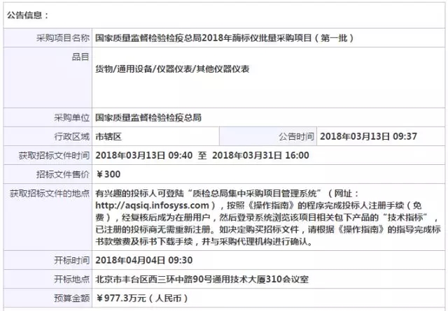 國家質檢總局現就2018年酶標儀批量采購項目(第一批)進行公開招標,采購項目涉及貨物、通用設備、儀器儀表及其他儀器儀表,預算977.3萬元。有興趣的投標人,可以在2018年3月31日前投遞標書,2018年4月4日開標。