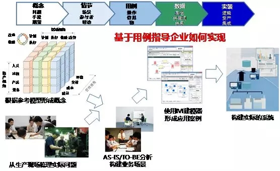 IVI提出IVRA的一個主要目的在于分析制造過程中哪里存在問題,并理清提供解決方案的系統(tǒng)范圍[9]。因此,IVI在定義IVRA模型的同時,配套實施了一系列步驟,來推動IVRA在智能制造中得以真正應(yīng)用,如圖9所示。首先基于概念化的IVRA統(tǒng)一參考架構(gòu)模型,定義用戶(工廠)生產(chǎn)現(xiàn)場中存在的實際問題,經(jīng)過AS-IS/TO-BE分析,使用“IVI用例器”工具來形式化描述業(yè)務(wù)場景,最終指導(dǎo)在工廠中構(gòu)建實際的制造系統(tǒng)。這種標準化描述的業(yè)務(wù)場景更容易取得解決方案供應(yīng)商和制造用戶的一致理解。