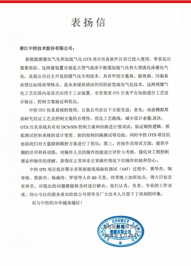 3月20日,浙江中控技術(shù)股份有限公司仿真事業(yè)部收到一封來自鄂爾多斯新能能源有限公司(簡稱“新能能源”)的表揚(yáng)信。