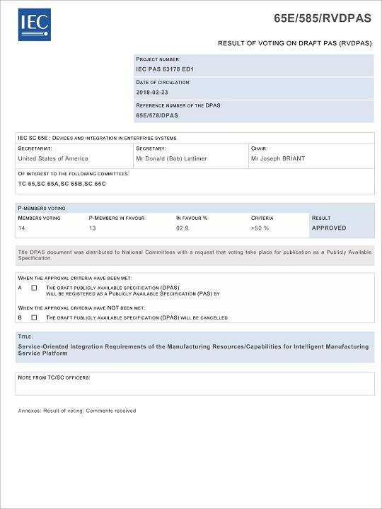 經國際電工委員會工業過程測量控制與自動化技術委員會(IEC/TC65)投票,由中國提出的《智能制造服務平臺制造資源接入集成要求》標準提案,以92.9%的通過率成為國際上首個面向智能制造服務平臺的資源接入集成規范標準,即IEC PAS 63178:Service-Oriented Integration Requirements of the Manufacturing Resources/Capabilities for Intelligent Manufacturing Service Platform。