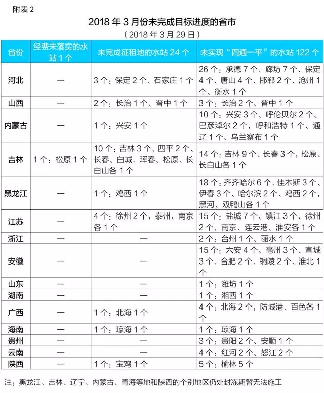 截至2018年3月29日,959個需地方新建的水站中,958個已落實經費,占99.9%,較上月提高21.4個百分點;935個完成征(租)地,占97.5%,較上月提高36.6個百分點;837個實現“四通一平”,占87.3%,較上月提高40.7個百分點;591個已開工建設(黑龍江、吉林、遼寧、內蒙古、青海等地和陜西的個別地區仍處封凍期暫無法施工),占61.6%,較上月提高53.7個百分點(詳見附表1)。
