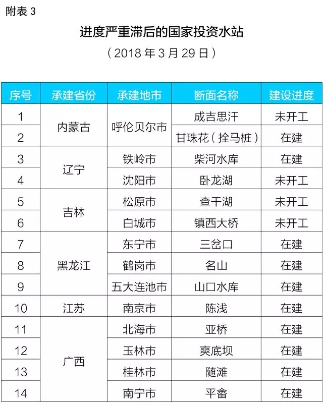 河北、吉林、江蘇、黑龍江、安徽、內蒙古、陜西、山西、廣西、云南、貴州、海南、浙江、山東、湖南等15個省(區)仍有24個水站未完成征(租)地,122個水站未實現“四通一平”,工作進度滯后;特別是吉林省松原市至今仍有1個斷面尚未落實建設資金,工作進度嚴重滯后(詳見附表2)。