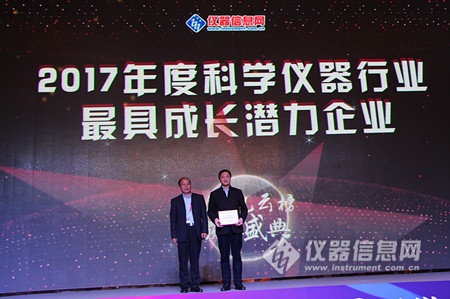 4月15日晚, ACCSI 2018的“儀器及檢測風云榜頒獎盛典”上,年會主辦方公布了“2017科學儀器行業最具成長潛力企業”獲獎企業——丹東百特儀器有限公司獲此殊榮。中國儀器儀表學會分析儀器分會秘書長劉長寬為獲獎企業頒獎,丹東百特總經理董青云代表公司領獎。