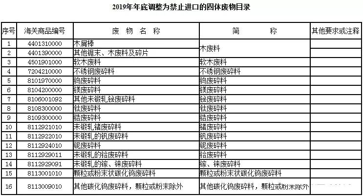 二、將不銹鋼廢碎料、鈦廢碎料、木廢碎料等16個品種固體廢物(見附件2),從《限制進口類可用作原料的固體廢物目錄》《非限制進口類可用作原料的固體廢物目錄》調入《禁止進口固體廢物目錄》,自2019年12月31日起執行。