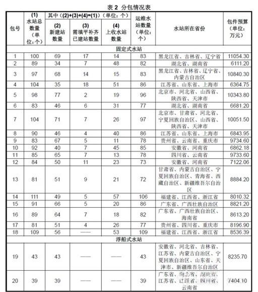 此次項目共采購1087個國家地表水自動監測站(以下簡稱水站)的建設及其三年運維服務、531個已建水站的三年運維服務、135個國家已建水站的儀器設備填平補齊。其中,1~18包為固定式水站,19~20包為浮船式水站。本項目預算為16.8億元,最終中標金額為158101.5852 萬元,中標廠商包括北京尚洋東方環境科技有限公司、宇星科技發展(深圳)有限公司、廈門隆力德環境技術開發有限公司、力合科技(湖南)股份有限公司、上海科澤智慧環境科技有限公司、北京雪迪龍科技股份有限公司、杭州綠潔水務科技股份有限公司、北京晟德瑞環境技術有限公司、中興儀器(深圳)有限公司、南瑞集團有限公司、廣西先得環保科技有限公司、廣州市怡文環境科技股份有限公司、長江水利委員會長江科學院共13家廠商。