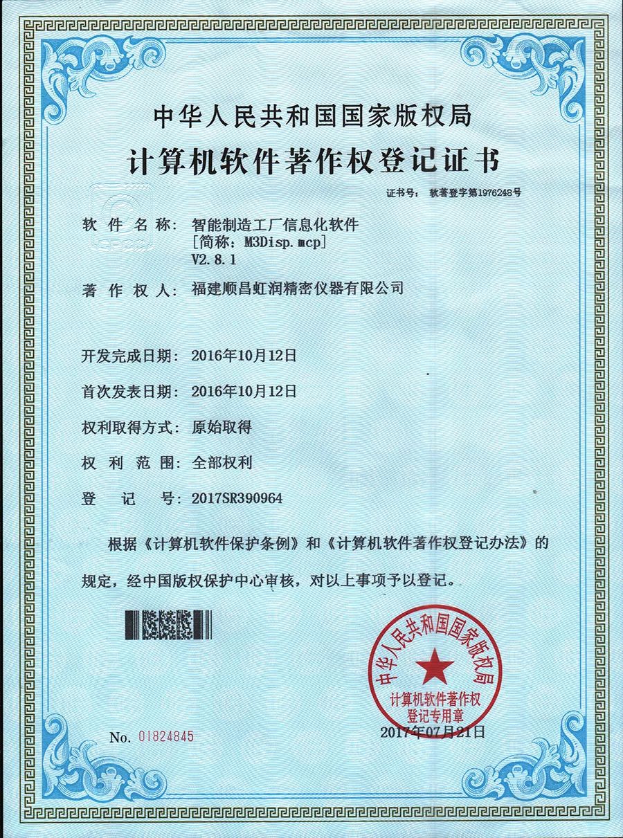 虹潤公司再傳喜訊,由虹潤公司自主開發的智能制造工廠信息化軟件榮獲國家軟件著作權版權證書。