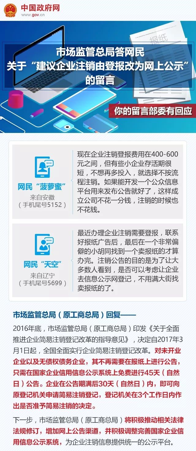 下一步,市場監(jiān)管總局(原工商總局)將積極推動(dòng)相關(guān)法律法規(guī)修訂,增加網(wǎng)上公告渠道,并積極調(diào)整完善國家企業(yè)信用信息公示系統(tǒng),為企業(yè)注銷信息提供統(tǒng)一的公示平臺(tái),以方便社會(huì)公眾查詢,降低各類市場主體的辦事成本,滿足群眾需要。