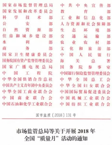 2018年9月,市場監管總局聯合中共中央宣傳部、教育部、工業和信息化部、銀保監會、全國總工會、共青團中央、機械工業聯合會等共34個部門,以“加強市場監管 建設質量強國”為主題,共同部署開展2018年全國“質量月”活動。
