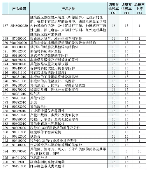 其中,將多元件集成電路、非電磁干擾濾波器、書(shū)籍、報(bào)紙等產(chǎn)品出口退稅率提高至16%,將竹刻、木扇等產(chǎn)品出口退稅率提高至13%,將玄武巖纖維及其制品、安全別針等產(chǎn)品出口退稅率提高至9%。其中水、氣表產(chǎn)品出口退稅率提高至16%。