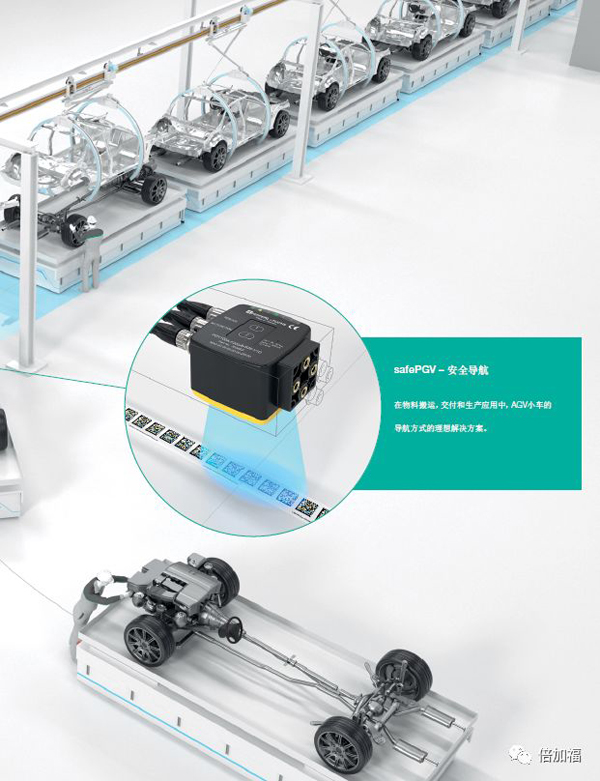 憑借其創新技術,safePGV是AGV小車安全導航方式的理想解決方案。除了絕對定位功能外,讀頭還提供安全可靠的用于控制AGV所需的全部數據,應用于汽車工業生產線。