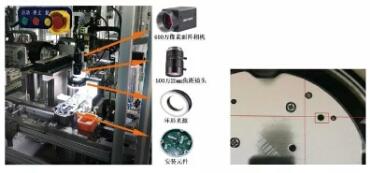 海螺8是海康威視工廠生產(chǎn)的一款攝像頭,其裝配需完成前蓋定位、泡棉上料、透鏡定位安裝、燈板定位安裝鎖附、前端組件定位安裝鎖附等一系列動(dòng)作,整個(gè)過(guò)程應(yīng)用了大量機(jī)器人與機(jī)器視覺(jué)聯(lián)合定位引導(dǎo)。如圖4左所示的燈板鎖附工位負(fù)責(zé)燈板鎖附過(guò)程中螺釘?shù)膩?lái)料定位與引導(dǎo)安裝,由于設(shè)備安裝空間的局限性,項(xiàng)目中選擇了空間需求更小、工位更加節(jié)省、安裝更靈活的活動(dòng)相機(jī)方式。海康威視自主研發(fā)生產(chǎn)的600萬(wàn)像素面陣相機(jī)配合25mm焦距的500萬(wàn)鏡頭,連同環(huán)形LED光源安裝在機(jī)械臂末端,隨同機(jī)械臂一同運(yùn)動(dòng)。