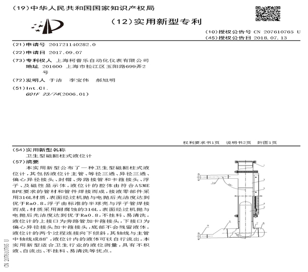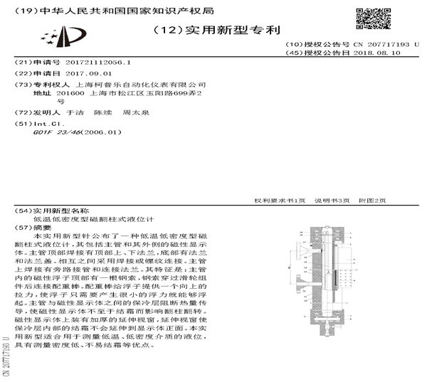 上海柯普樂自動化儀表有限公司最近獲得了三個型號液位計產品的實用新型專利授權,分別是:衛生型、汽化型和低溫低密度型。這三款產品通過獨特的設計、材料及工藝滿足在不同行業的特殊工藝要求,如:食品及飲料、醫藥、液化氣、乙烯制造。此三項專利申請中共有11項權利要求得到保護,日前已收到了國家知識產權局的授權通知,預計將在一個月左右收到專利證書。專利申請的通過,使得知識產權得以保護,提升了柯普樂的品牌形象,同時也鼓勵柯普樂人更加深入地貼近客戶和了解各種應用。