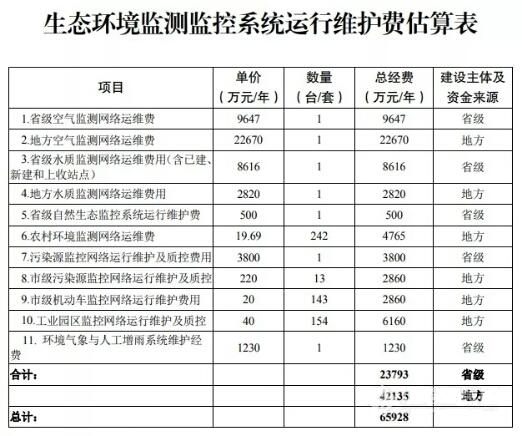 對于運行維護,包括省級空氣監測網絡運維費、地方空氣監測網絡運維費、省級水質監測網絡運維費、地方水質監測網絡運維費用、省級自然生態監控系統運行維護費、農村環境監測網絡運維費、污染源監控網絡運行維護及質控費用、市級污染源監控網絡運行維護及質控、市級機動車監控網絡運行維護費用、工業園區監控網絡運行維護及質控、環境氣象與人工增雨系統維護經費等。