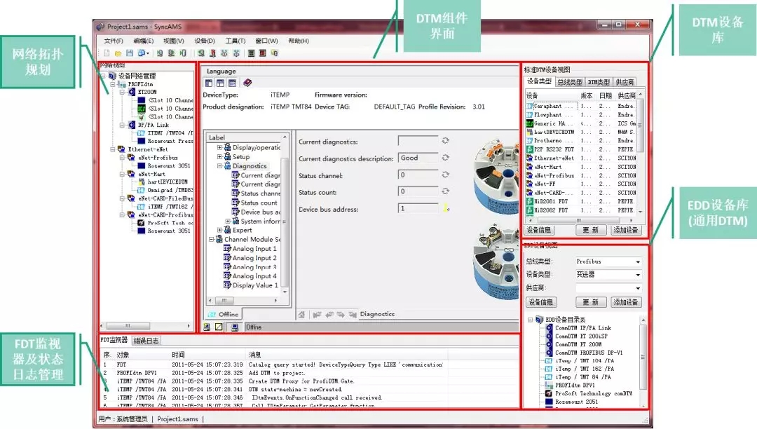 NT6000系統還配備了智能設備管理軟件SyncAMS設備管理軟件,應用了FDT技術,數據透明訪問,支持不同網絡的復雜嵌套通訊,支持復雜設備描述,包括高級診斷和預測維護等功能描述。支持設備廠家的專有技術,可以嵌套設備廠家的專業指導,充分展現各廠商智能設備的固有特性。脫離了死板的表格數據。