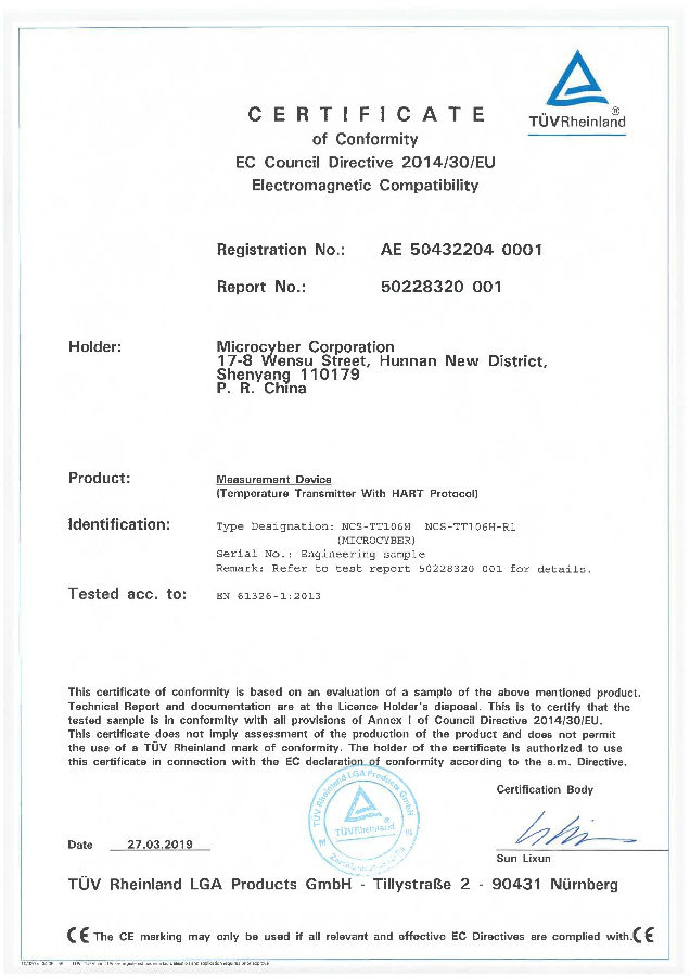 2019年3月27日,沈陽中科博微科技股份有限公司自主研發的NCS-TT106H頭部安裝式HART溫度變送器、NCS-TT106H-R1 導軌安裝式HART溫度變送器順利通過了TUV萊茵的CE-EMC認證。這標志著中科博微的HART溫度變送器已加入歐盟市場免檢產品行列,拿到了進入歐盟市場銷售的通行證。推動了"中國制造"向"中國創造"的轉變,使中國向高端裝備制造業的邁進又近了一步!