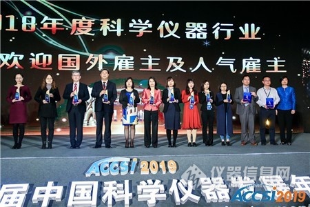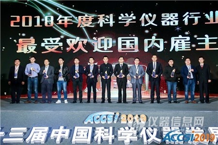 2019年4月18日晚,中國科學儀器行業的“達沃斯論壇”——2019中國科學儀器發展年會(ACCSI 2019)于“儀器風云榜頒獎盛典”上,為獲得“2018年度科學儀器行業最受歡迎雇主(國內雇主)”、“2018科學儀器行業最受歡迎雇主(國外雇主)”、“2018科學儀器行業最佳人氣雇主”的企業頒獎。山東大學教授臧恒昌、環境保護部標準樣品研究所應用技術研究室主任劉濤、儀器信息網CEO唐海霞為獲獎代表頒獎。