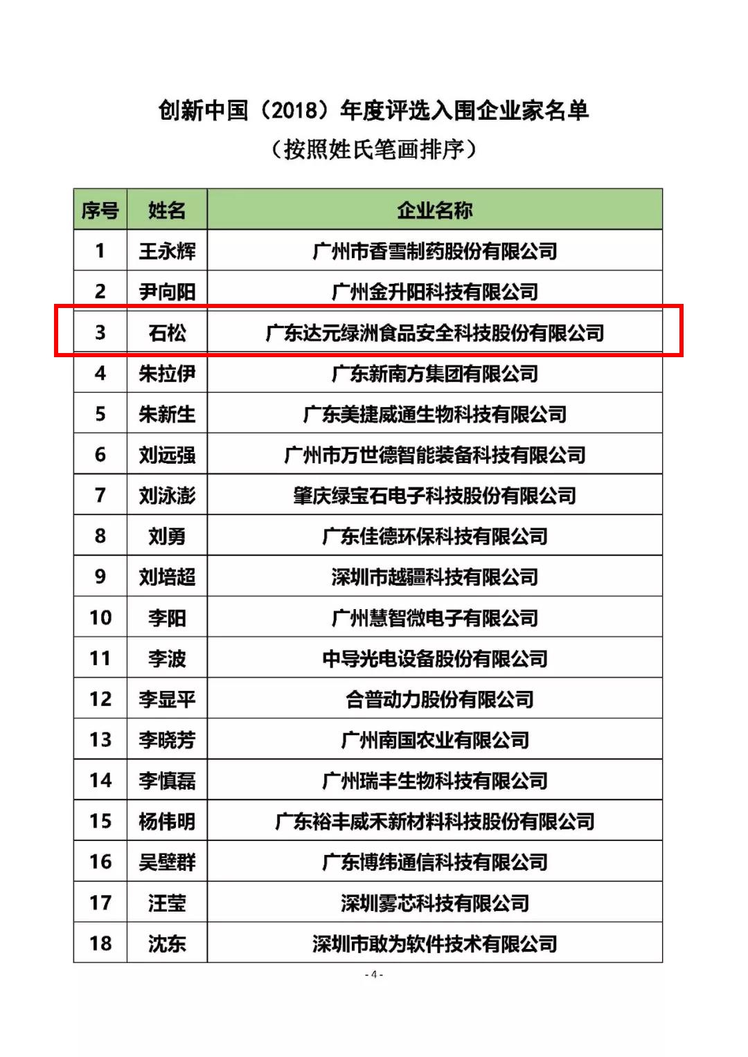 經(jīng)過資質(zhì)審核、專家評審,層層篩選,5月7日,創(chuàng)新中國2018年度評選入圍企業(yè)家名單發(fā)布在科技日報(bào)社·中國科技網(wǎng)中,廣東達(dá)元綠洲食品安全科技股份有限公司董事長石松成功入選!
