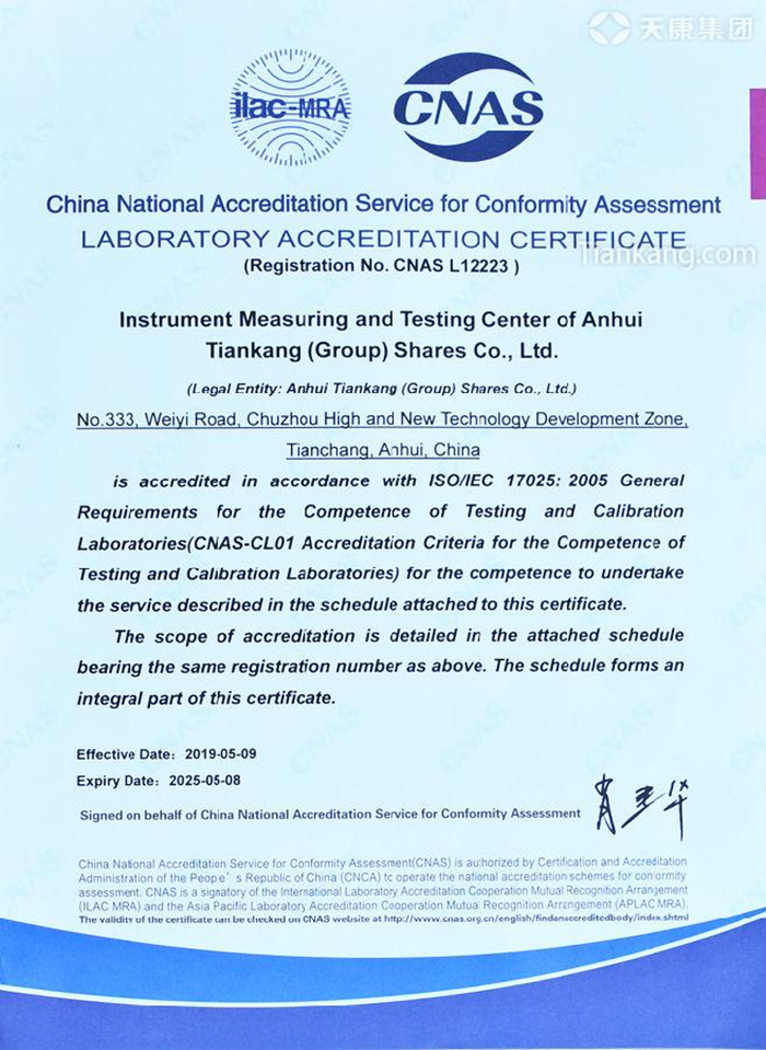 近日,經(jīng)過緊張而復(fù)雜的審核程序,安徽天康(集團(tuán))股份有限公司儀器儀表計(jì)量檢測中心順利通過中國合格評(píng)定國家認(rèn)可委員會(huì)的文審和現(xiàn)場審核,并獲得認(rèn)證證書(證書編號(hào):L12223)。