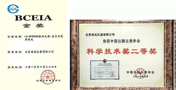 2015年10月,海光公司LC-AFS9560液相色譜-原子熒光聯(lián)用儀獲得第十六屆BCEIA 金獎。為表彰該系列產(chǎn)品技術(shù)創(chuàng)新性及在市場銷售方面的出色表現(xiàn),以此類儀器為課題產(chǎn)品的《痕量砷、汞及其有毒化合物形態(tài)檢測儀的完善和產(chǎn)業(yè)化培育》項目榮獲了2017年中國儀器儀表學(xué)會頒發(fā)的科學(xué)技術(shù)獎二等獎。