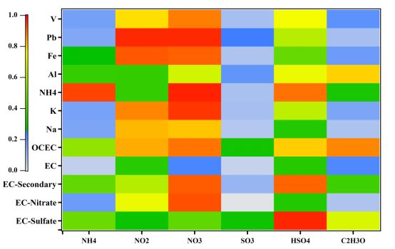 NH4+與OCEC粒子、EC-Sulfate和EC-Secondary的混合比較高,與EC-nitrate的混合程度較低,大氣中的氨更容易與有機物和硫酸鹽相結合。